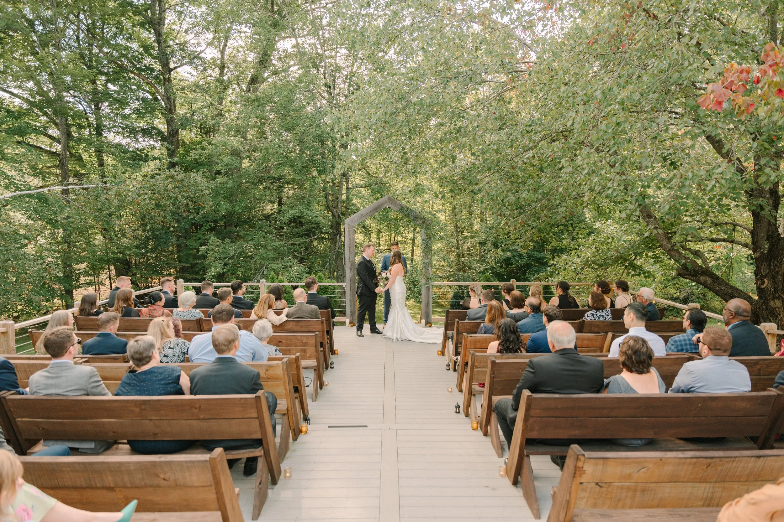 Following the ceremony, guests may transition effortlessly via the staircase to the back lawn for photographs, while the adjoining deck provides an ideal space for cocktail hour. Surrounded by vibrant seasonal foliage, the ceremony deck offers a naturally elegant backdrop that feels both intentional and effortlessly beautiful.